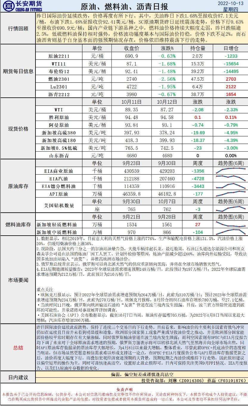 10月13日,长安期货发布原油早评,认为需求预期增速再遭下调,宏观经济作用下油价或持续下行,建议偏空短差或谨慎逢高沽空。