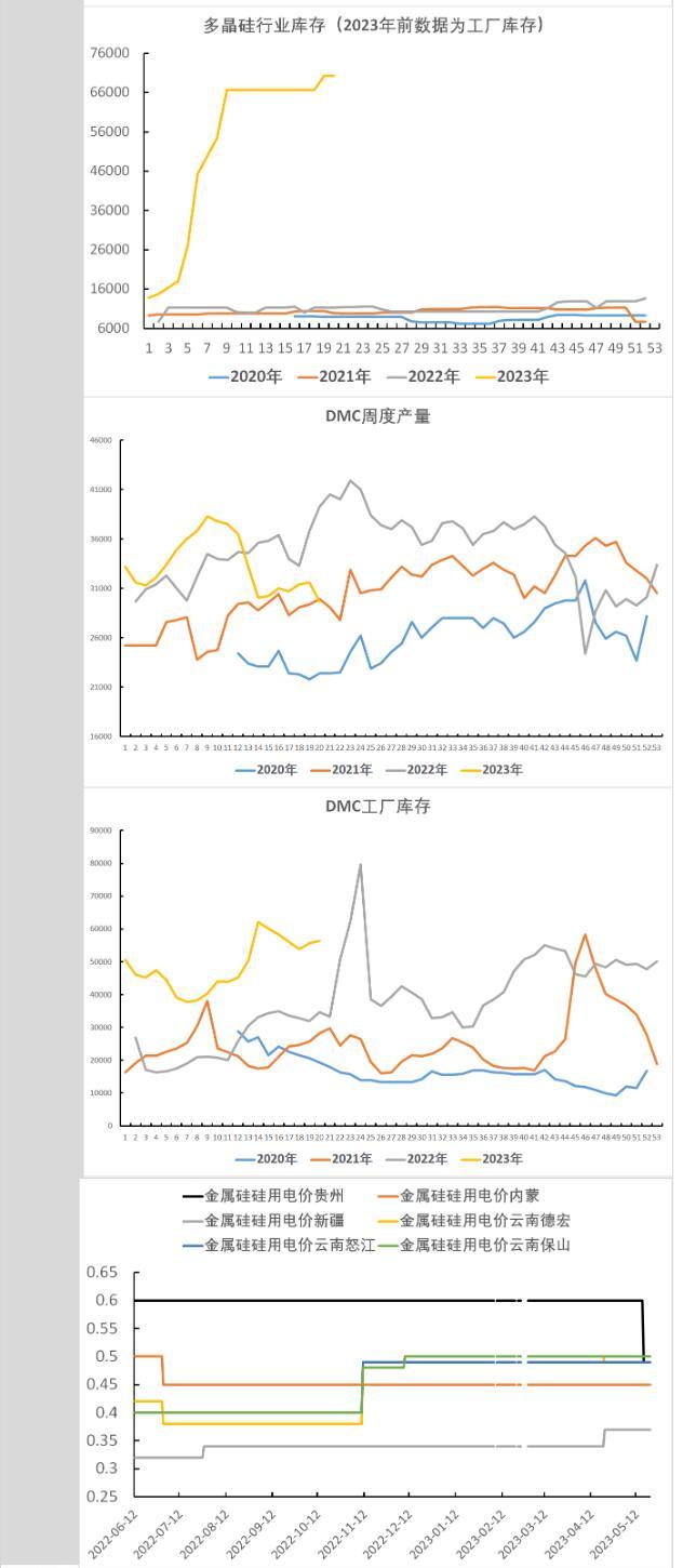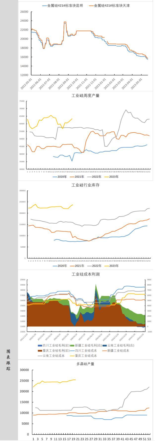 从目前数据来看,有机硅今年旺季不旺,高库存始终难以去化。在目前利润新低的情况下,厂家可能进一步减产。6月计划新增产能也可能延期投产。多晶硅价格走低,库存高位,目前利润率150%以上。行业竞争白热化,多晶硅企业并不会减产。随着新增产能爬坡,多晶硅产量将逐渐增加。目前国内新能源汽车蓬勃发展,汽车产量以及出口量均稳步增加,对铝合金需求也持续增加。综合来看,5月份铝合金产量环比将有所增加,对工业硅的需求也将增加。从区域来看,新疆、内蒙地区开工率较高,厂家生产积极性相对较强。目前云南、重庆地区工业硅生产利润好转,产量将有所增加。新疆地区工业硅开工率已经处于高位,工业硅产量增量有限。四川地区工业硅成本仍然较高,不过马上将迎来丰水期,电价有下调可能,四川地区工业硅产量后续也有增加的可能性。目前工业硅供需两端均有增加,短期库存仍将处于高位。有机硅有进一步减产的可能,工业硅产量仍在增加,工业硅可能仍处于累库周期。