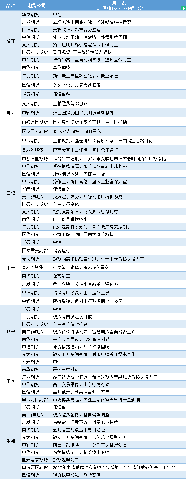 期货公司观点汇总一张图:5月24日农产品(棉花、豆粕、白糖、玉米、鸡蛋、生猪等)