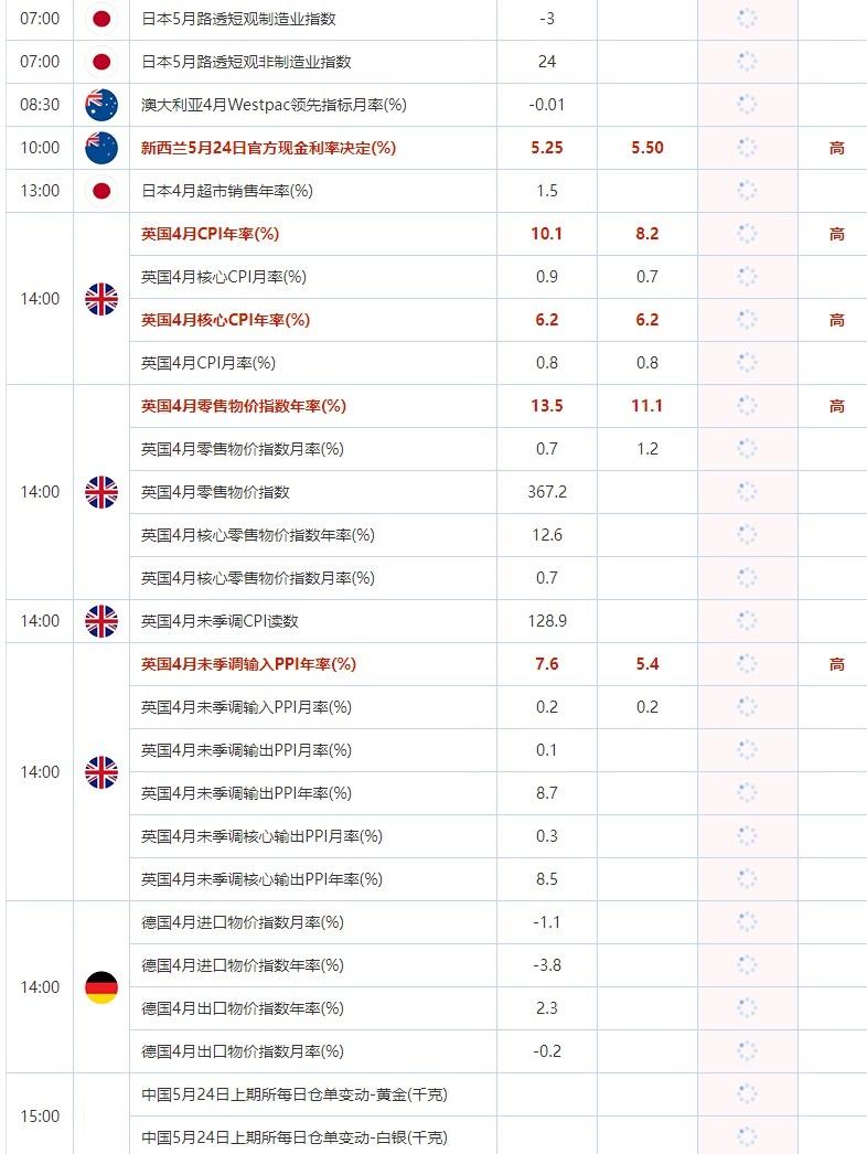 14:00 英国4月CPI年率(%) , 前值 10.1 , 预期值 8.2 , 公布值:待发布14:00 英国4月核心CPI月率(%) , 前值 0.9 , 预期值 0.7 , 公布值:待发布