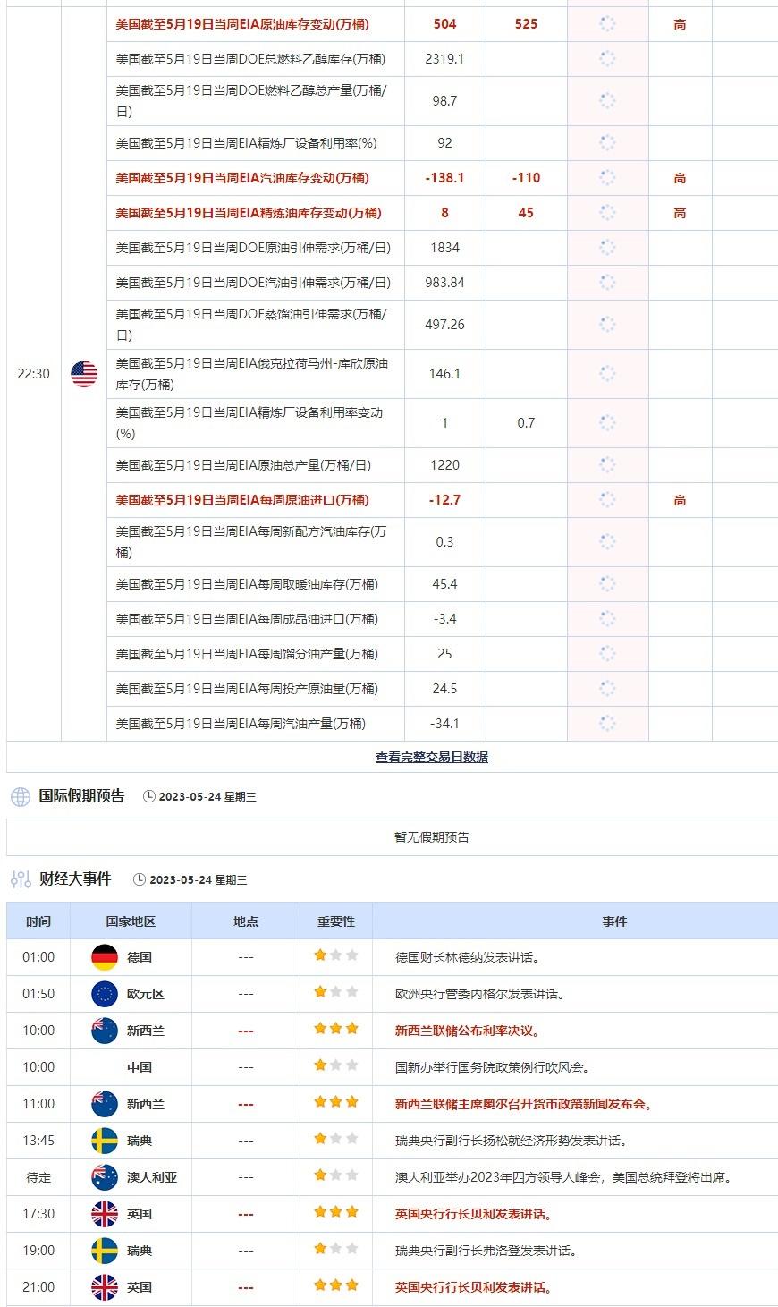 22:30 美国截至5月19日当周EIA原油库存变动(万桶) , 前值 504 , 预期值 525 , 公布值:待发布22:30 美国截至5月19日当周DOE总燃料乙醇库存(万桶) , 前值 2319.1 , 预期值 -- , 公布值:待发布
