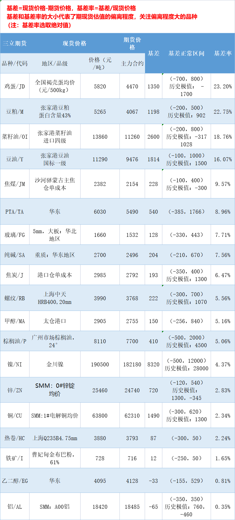 三立期货10月13日基差:一张图尽览有色金属、黑色系、能源化工和农产品基差(按基差率从大到小排序)——排名前三的期货品种分别是鸡蛋、豆粕、菜籽油,基差率分别是23.20%、22.75%、18.76%。