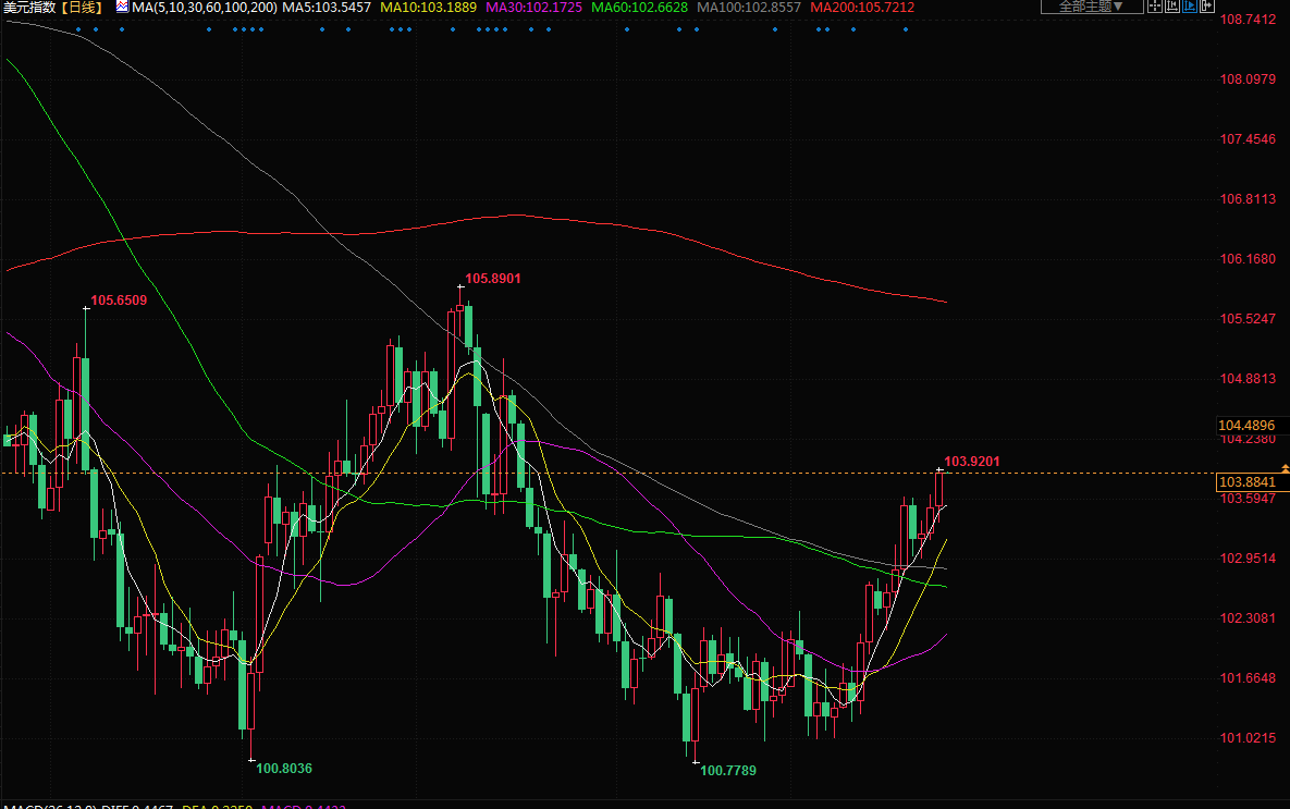 美元指数早些时候达到103.91,是3月20日以来最高。该指数尾盘上涨0.319%,报103.86。