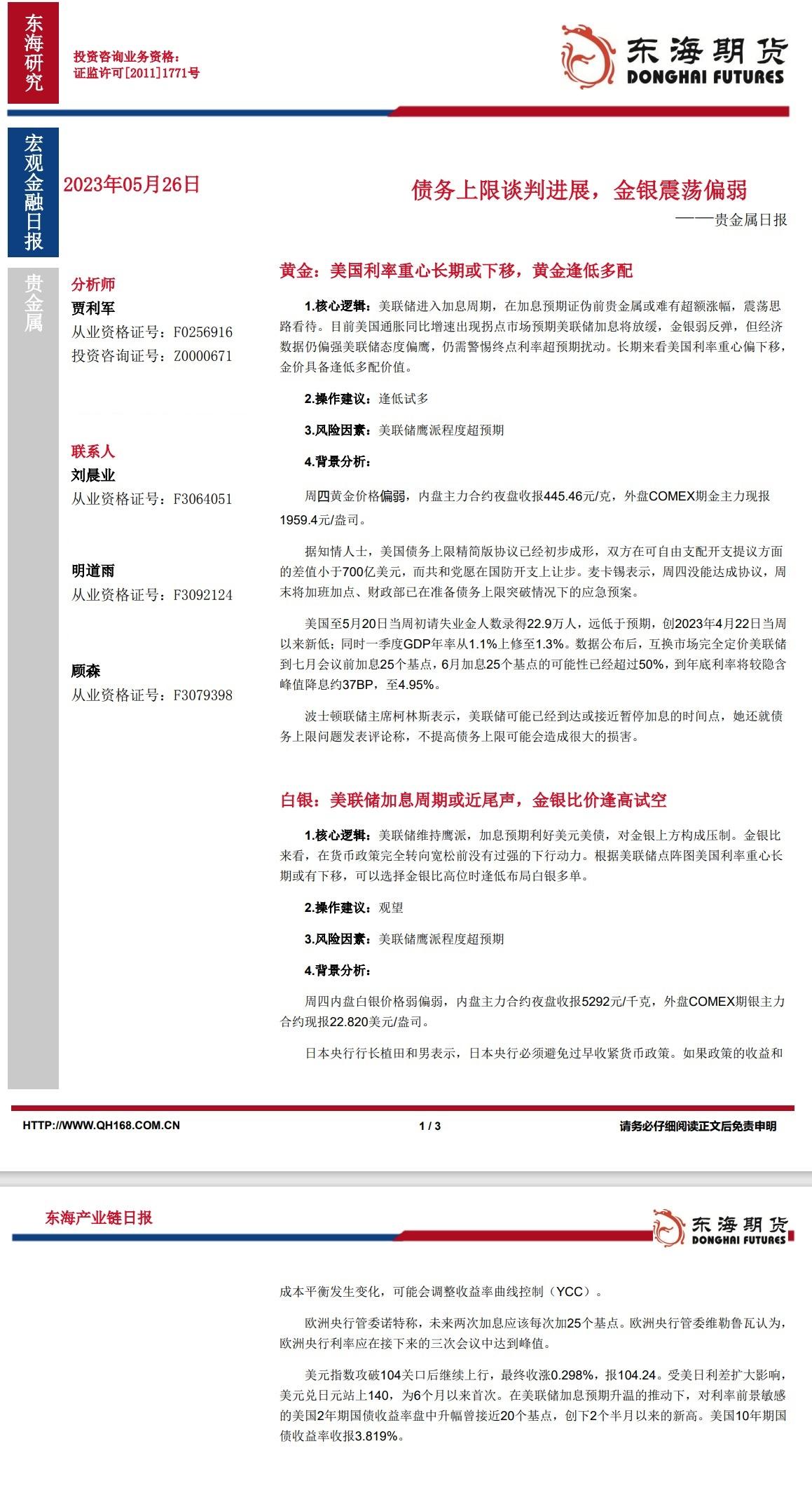 标题:【东海期货5月26日产业链日报】贵金属篇:债务上限谈判进展,金银震荡偏弱
