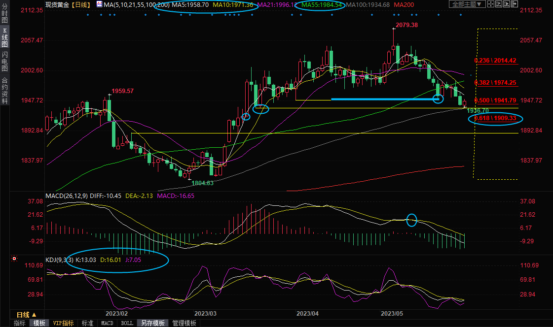 本交易日将迎来美国4月份耐用品订单月率、美国4月PCE物价指数年率、美国4月个人支出月率等数据,市场影响力较大,投资者需要予以关注。对耐用品订单的数据预期略微偏向利多金价,但对PCE和个人支出数据的预期偏向利空金价。此外,投资者需要继续关注美国债务上限谈判的进一步消息。日线级别:震荡下跌;MACD死叉且下穿零轴,布林线轻微开口,短期均线向下发散,在收复5日均线1958.70前,后市仍偏向下行,关键支撑在100日均线1934.68附近,3月22日触及的近两个月低点支撑也在该位置附近,如果失守该支撑,则增加后市看空信号,进一步支撑参考3月17日低点1918.15附近,1804-2079涨势的61.8%回撤位支撑在1909.33附近,然后是1900整数关口附近支撑。
