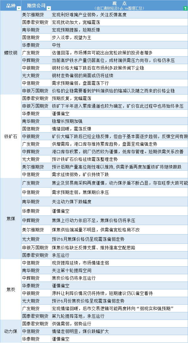 标题:期货公司观点汇总一张图:5月29日黑色系(螺纹钢、焦煤、焦炭、铁矿石、动力煤等)