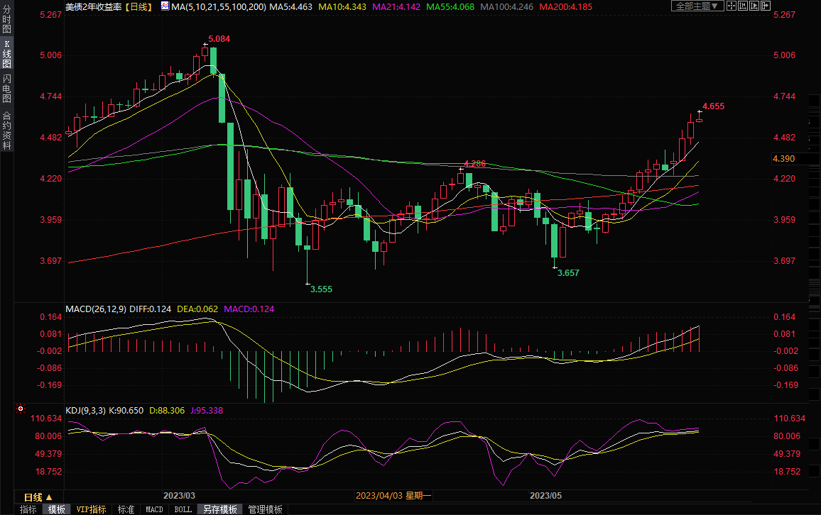 通常追随利率预期的两年期国债收益率上周五跳升5.2个基点,至4.562%,为连续第三周上周,周一亚市,该收益率继续冲高,最高触及4.655%,为3月10日以来新高。
