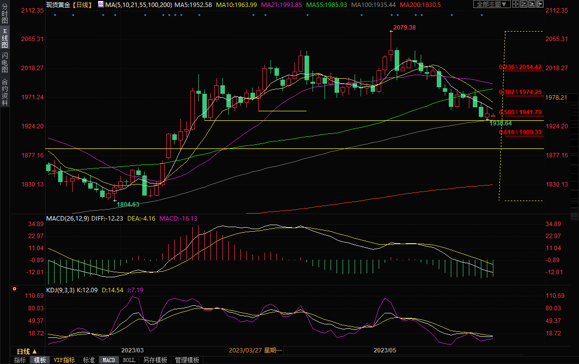 现货黄金窄幅震荡,目前交投于1943.10美元/盎司附近,虽然美国债务上限谈判达成了初步协议,市场担忧情绪降温,但该因素在上周已经有所消化,上周金价大跌1.5%,为连续第三周下跌,美国4月份PCE等数据强于预期,也提升了美联储6月份加息预期,美元上周大涨1%,为连续第三周上涨,美债收益率涨至近两个半月高位,对金价打压明显,该因素料将进一步压制金价后市走势。