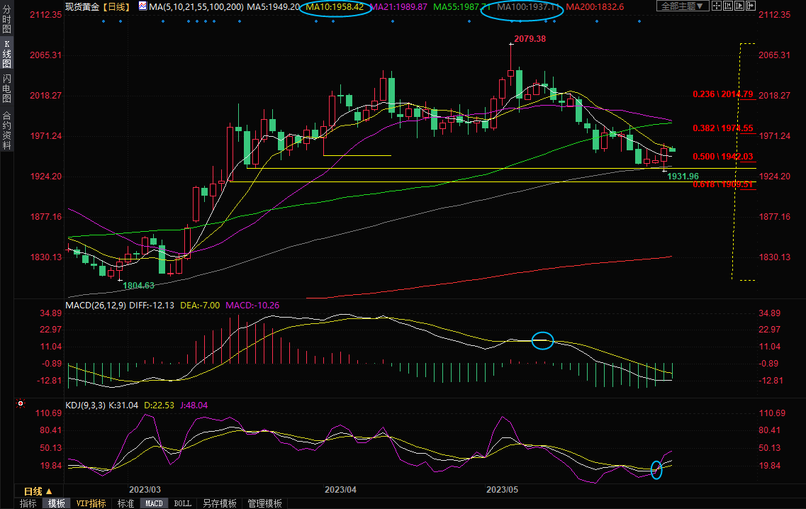 现货黄金窄幅震荡,目前交投于1955.19美元/盎司附近,守住了隔夜大部分涨幅。周二金价上涨15美元,100日均线失而复得后,多头强势反扑,收报1959.17美元/盎司,对美国债务上限协议的乐观情绪打击美元和美债收益率,美债收益率从两个半月高位大幅回落,给金价反弹提供机会,地缘局势紧张也吸引了一些逢低买盘支撑金价。