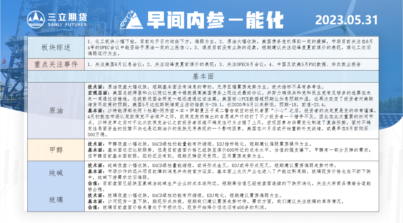 三立期货早间内参显示,原油大幅收跌,美国债务危机得到一定的缓解,市场目前关注在周末的OPEC会议中能否给予原油一定的上涨信心。煤炭目前没有止跌的迹象,短期建议关注迎峰度夏前煤价的表现,煤化工依旧偏弱运行为主。