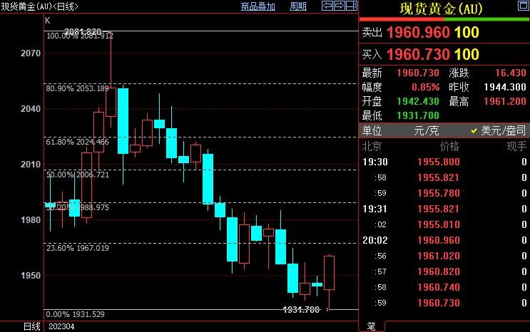 现货黄金在跌创3月17日以来新低至1931.96美元/盎司后企稳反弹,因