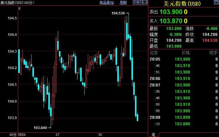 美元指数下跌0.36%至103.905。