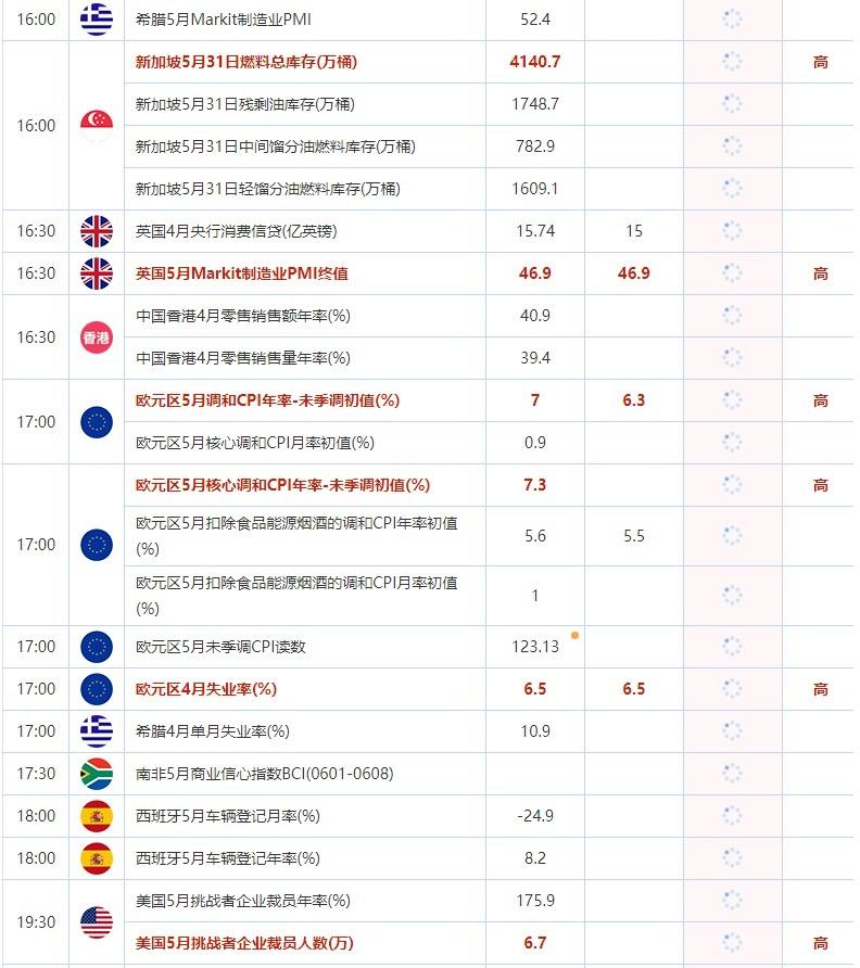 17:00 欧元区5月调和CPI年率-未季调初值(%) , 前值 7 , 预期值 6.3 , 公布值:待发布17:00 欧元区5月核心调和CPI月率初值(%) , 前值 0.9 , 预期值 -- , 公布值:待发布