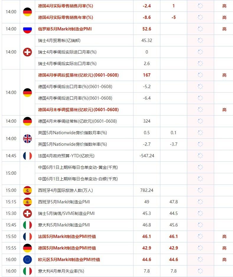 16:00 欧元区5月Markit制造业PMI终值 , 前值 44.6 , 预期值 44.6 , 公布值:待发布16:00 意大利4月单月失业率(%) , 前值 7.8 , 预期值 7.8 , 公布值:待发布