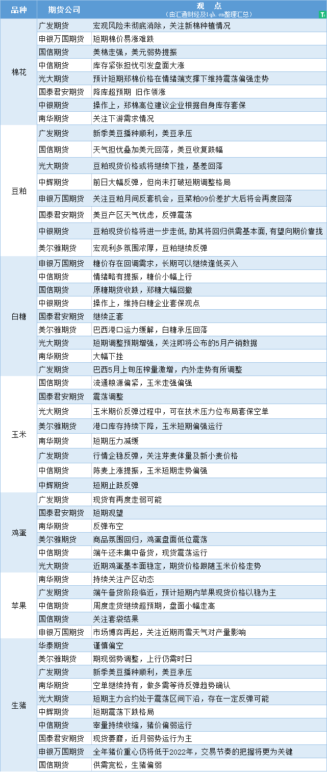 标题:期货公司观点汇总一张图:6月2日农产品(棉花、豆粕、白糖、玉米、鸡蛋、生猪等)