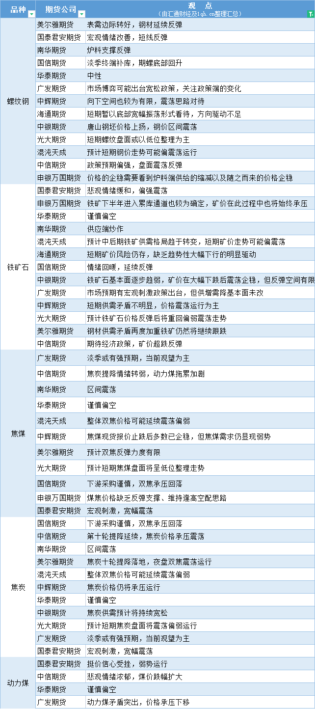 期货公司观点汇总一张图:6月2日黑色系(螺纹钢、焦煤、焦炭、铁矿石、动力煤等)