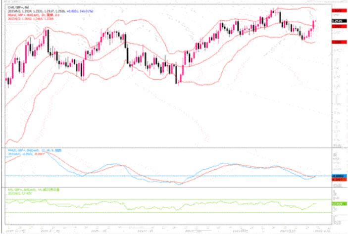 英镑兑美元反弹走高的走向。目前日线图上,镑美汇价重新穿过布林带中轨且回到各短期均线上方,MACD似乎形成金叉,RSI穿过均衡线向上摆动,显示英镑购入盘较为积极。但日内有美国非农公布,须谨慎英镑高位获利回落的风险发生。