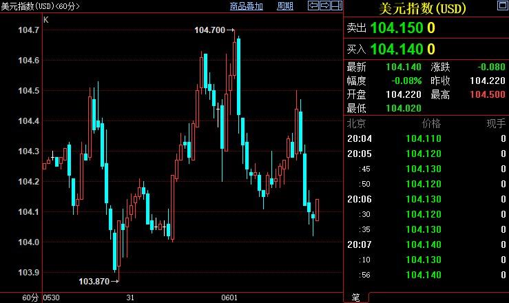 美元指数冲高回落,未能升破隔夜创下的3月16日以来新高104.702,支撑金价重新走强。