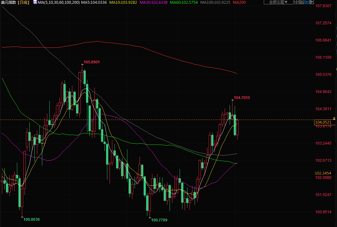美元指数尾盘上涨0.435%,报103.980,有望创下5月中旬以来的最大单日百分比涨幅。然而,本周美元下滑了0.2%,是5月初以来的最大单周跌幅。