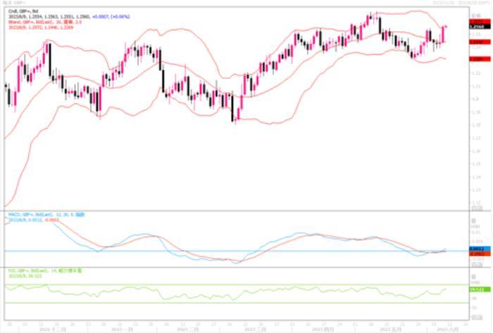英镑兑美元上涨1.01%,至两周多以来的高位1.2560收盘。经济合作暨发展组织(OECD)周三发布的预测显示,2023年英国通胀率将达到6.9%,将为所有发达经济体中最高。市场仍预期未来几个月英国央行将再加息100个基点以遏制价格上涨。对利率敏感的英国两年期公债收益率周四触及去年9月“小型预算”引发动荡以来的最高水平,货币市场几乎完全消化了英国央行在6月22日加息25个基点的预期,还预计该央行在8月和9月开会时也会采取类似行动。在英央行加息前景仍会保持强劲的预期下,英镑料会继续得到相应的支撑。日线图上,