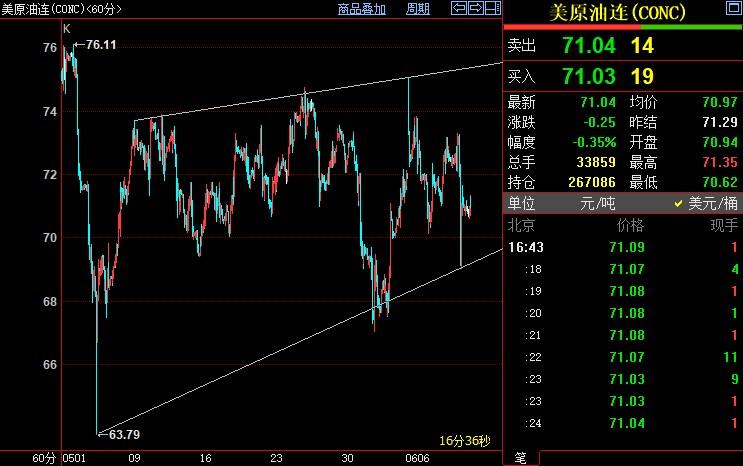 北京时间16:42,NYMEX原油期货下跌0.31%至71.07美元/桶;ICE