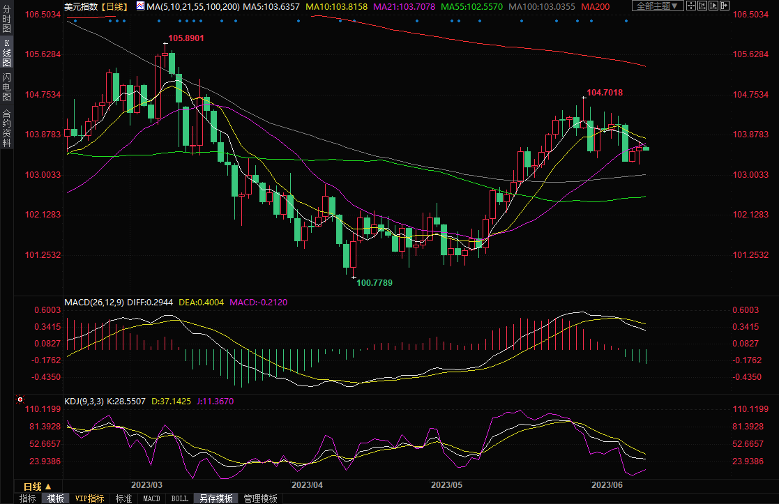 美元指数周一盘中一度下跌0.29%至103.24,为5月23日以来新低,不过尾盘收复跌幅,收报103.63,涨幅约0.09%,这令金价周一承压。不过,周二亚市,美元指数震荡走弱,目前已经回吐隔夜涨幅,交投于105.55附近;技术面来看,美元指数收到短期均线压制,短线面临进一步下行风险。