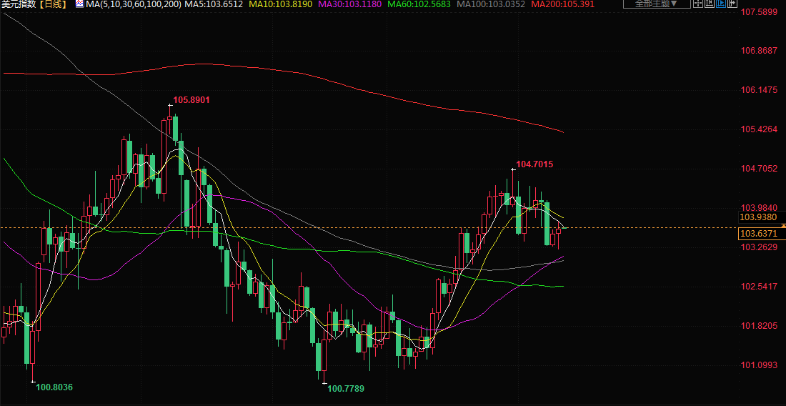美元指数纽约盘尾上涨0.1%,报103.64,上周下跌近0.5%,创4月中以来最大单周跌幅。欧元持平于1.0753美元,上周上涨0.4%,为大约一个月以来的首次周线涨幅。