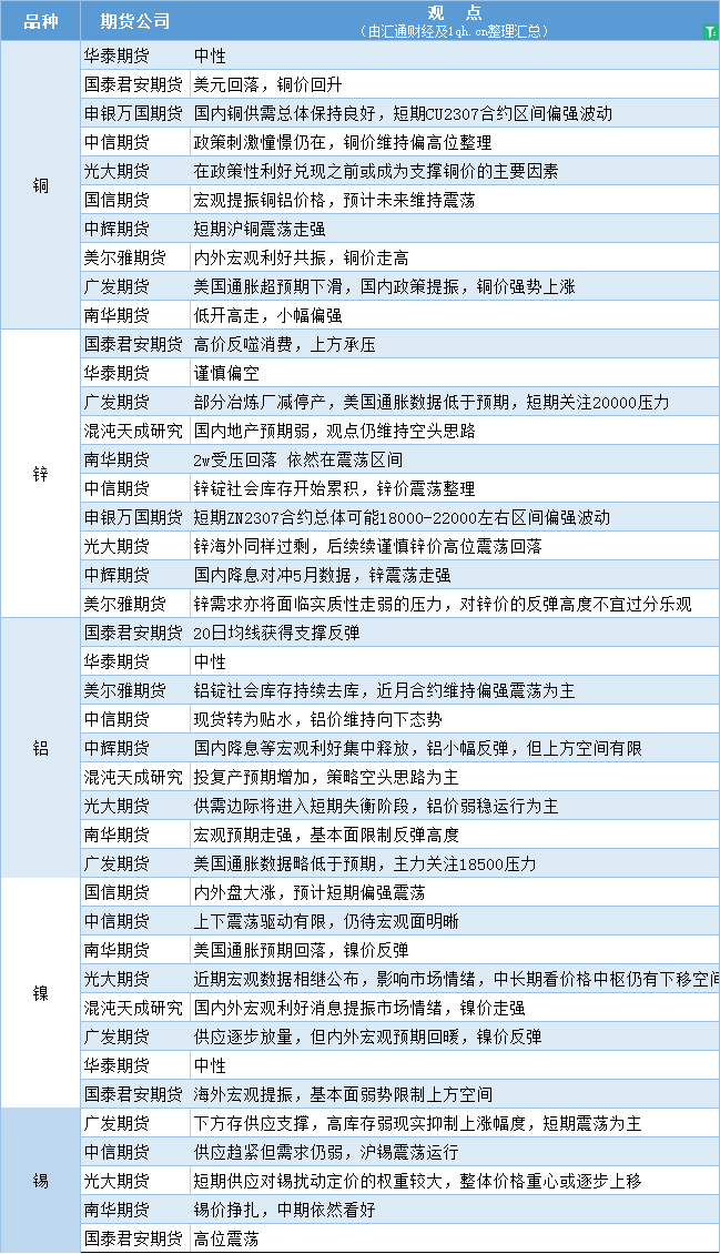 标题:期货公司观点汇总一张图:6月14日有色系(铜、锌、铝、镍、锡等)