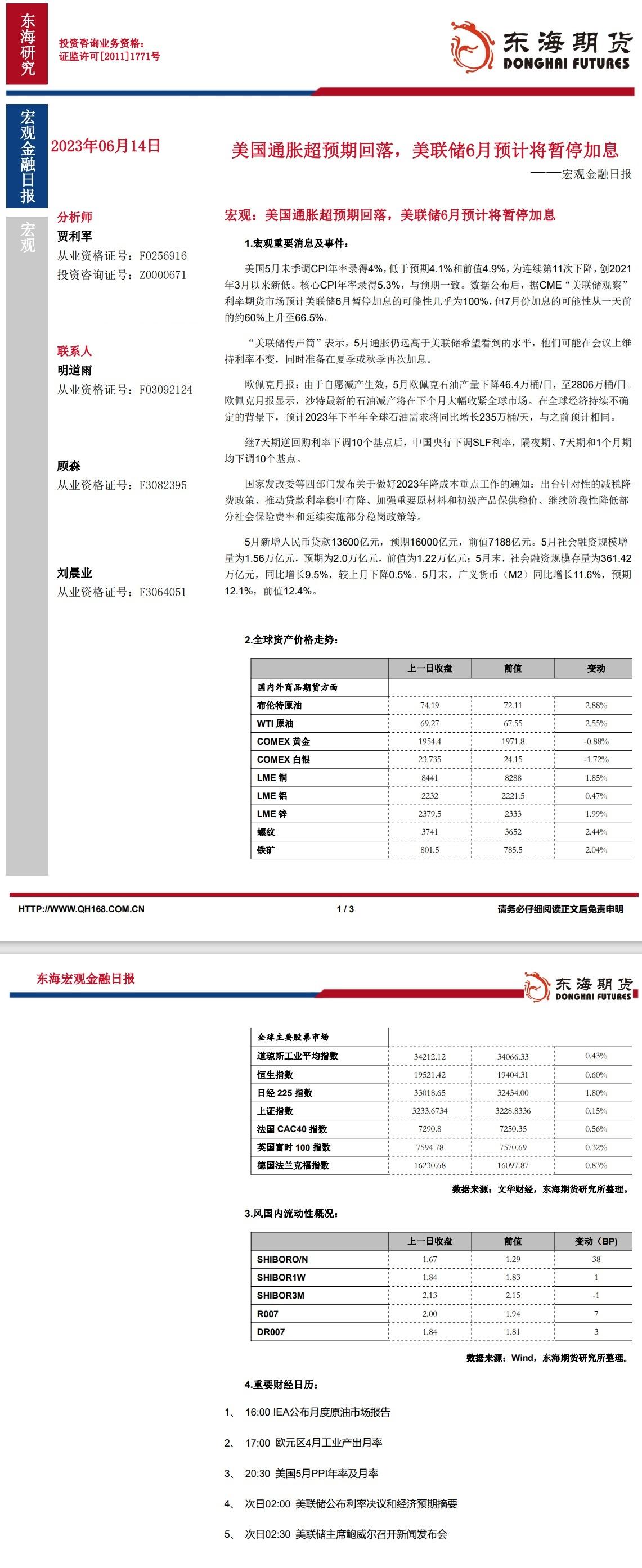 标题:【东海期货6月14日宏观金融日报】:美国通胀超预期回落,美联储6月预计将暂停加息