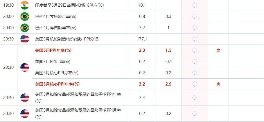 20:30 美国5月核心PPI年率(%) , 前值 3.2 , 预期值 2.9 , 公布值:待发布20:30 美国5月扣除食品能源和贸易的最终需求PPI年率(%) , 前值 3.4 , 预期值 -- , 公布值:待发布