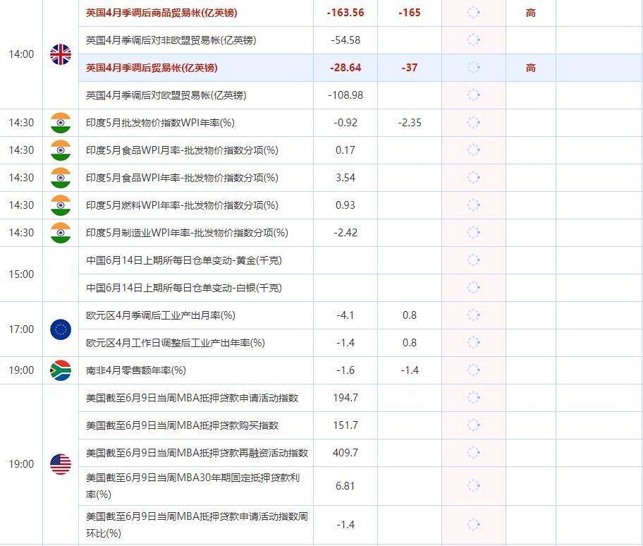 14:00 英国4月季调后商品贸易帐(亿英镑) , 前值 -163.56 , 预期值 -165 , 公布值:待发布14:00 英国4月季调后对非欧盟贸易帐(亿英镑) , 前值 -54.58 , 预期值 -- , 公布值:待发布