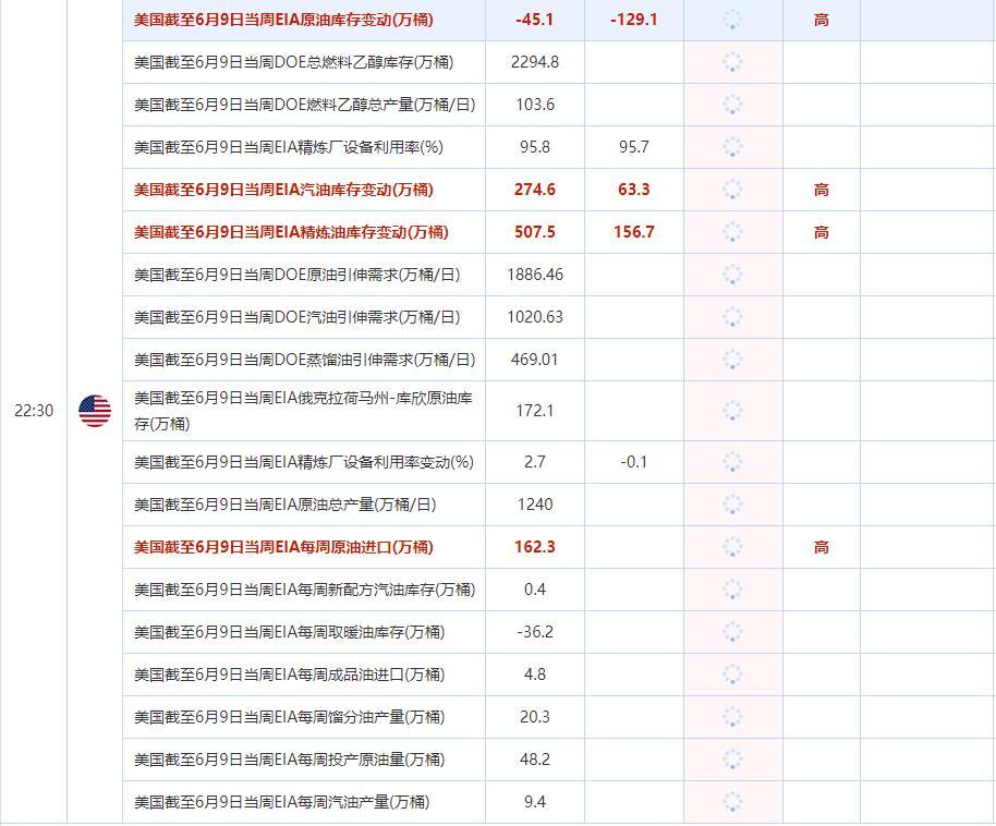 22:30 美国截至6月9日当周EIA汽油库存变动(万桶) , 前值 274.6 , 预期值 63.3 , 公布值:待发布22:30 美国截至6月9日当周EIA精炼油库存变动(万桶) , 前值 507.5 , 预期值 156.7 , 公布值:待发布