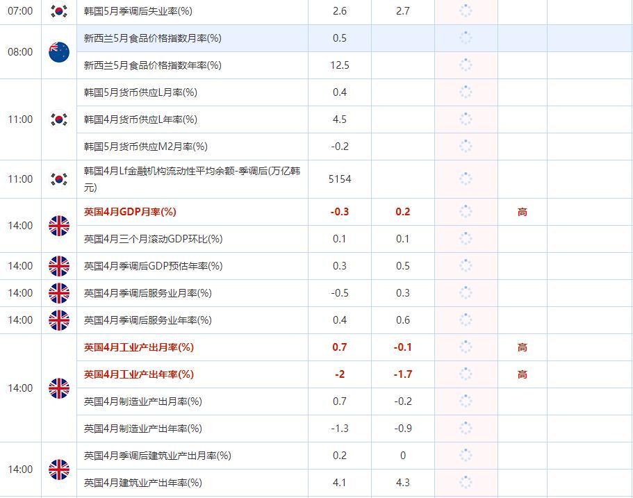 14:00 英国4月GDP月率(%) , 前值 -0.3 , 预期值 0.2 , 公布值:待发布14:00 英国4月三个月滚动GDP环比(%) , 前值 0.1 , 预期值 0.1 , 公布值:待发布