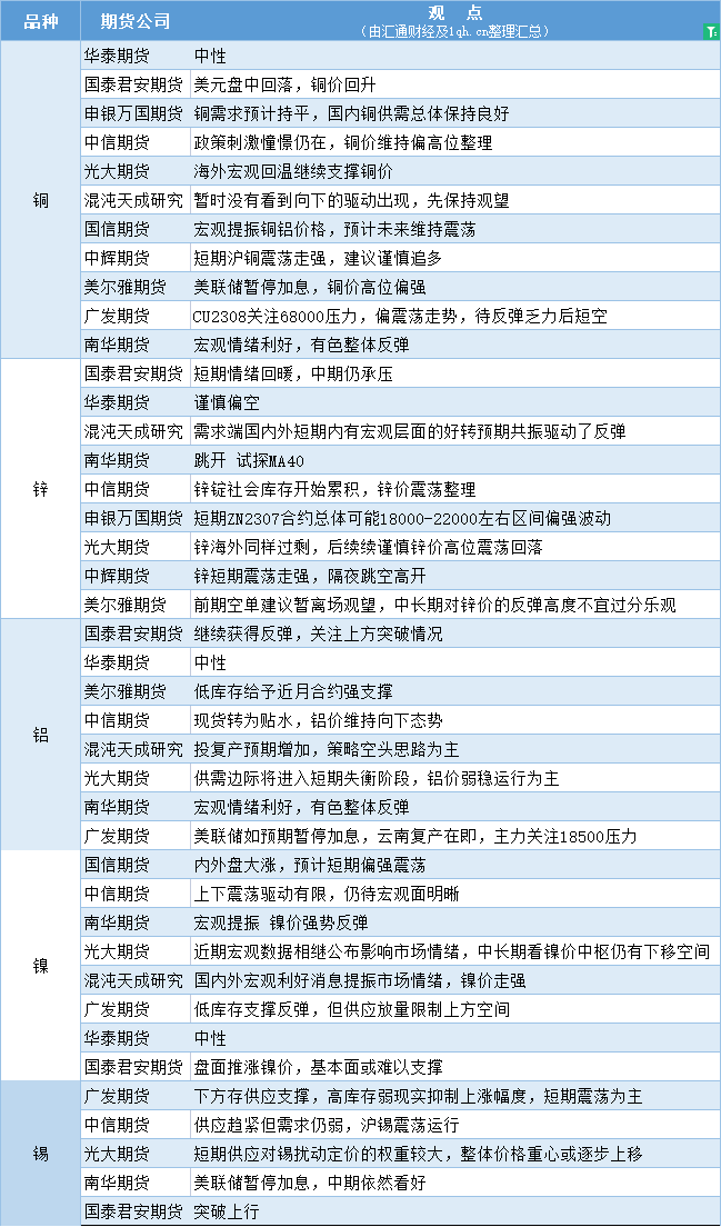 标题:期货公司观点汇总一张图:6月15日有色系(铜、锌、铝、镍、锡等)