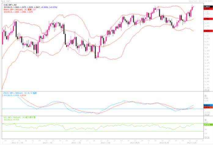 英镑兑美元当日上涨0.42%,收盘于1.2662水平,盘中最高一度接近1.27水平,创了年内新高。隔夜市场上,美联储跳过加息维持前值利率不变,刺激英镑继续走高。英国方面,英国国家统计局周三公布的数据显示,尽管制造业和建筑业出现收缩,但零售商和电影业帮助英国经济在4月一如预期增长0.2%,表明增长缓慢而不是衰退。而此前公布的就业以及薪资增长数据强劲,加深市场对英国央行今年将继续升息的预期。市场认为下周会议上加息25个基点的可能性为79%,加息50个基点的可能性为21%,并押注英国央行的指标利率(目前为4.5%)到2023年底可能最高达到5.7%。英镑利率预期继续提高,给到英镑较大的支持。英镑/美元当前完好运行在上行通道内,技术指标均呈上扬态势,预料英镑将会继续受到多头的抬捧而朝年内更高点位进发。