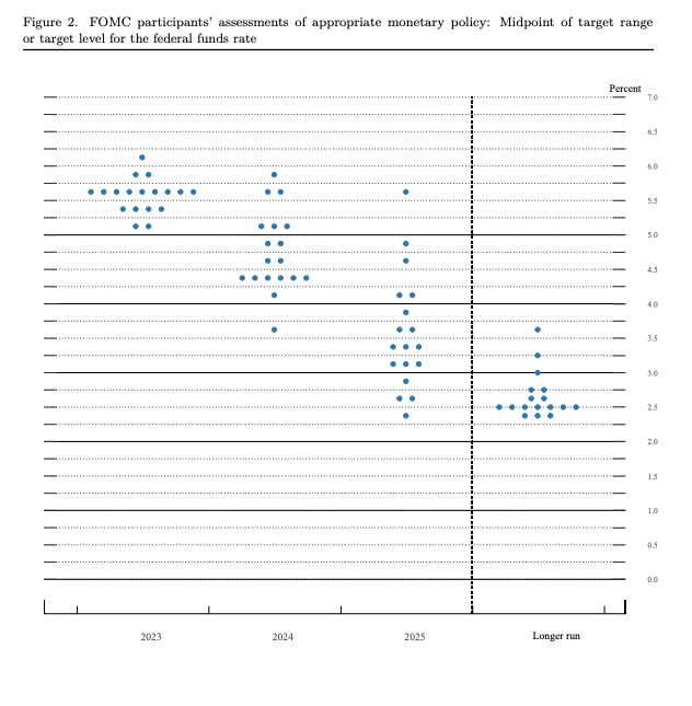 决策者现预计联邦基金利率今年将达到5.6%的峰值,这意味着在2023年还会有两次25个基点的加息,高于3月份发布的点阵图预测,当时的估计是5.1%。
