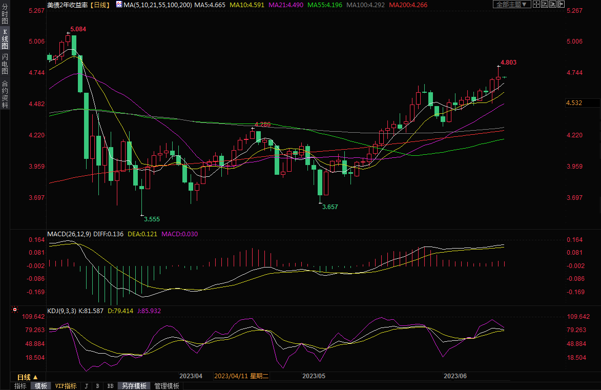 通常追随利率预期的两年期美国国债收益率周三尾盘上升0.3个基点,报4.699%,盘中稍早创下4.803%的三个月新高。