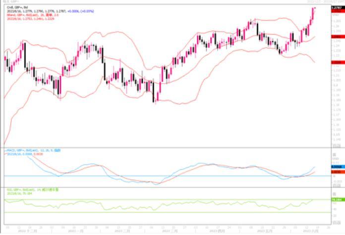欧元兑美元尾盘上涨1.1%,报1.0948美元,此前欧洲交易时段兑美元触及1.0952美元的五周高点。周四当天,欧洲央行一如预期将利率提高了25个基点,至3.5%,为22年来最高。央行其工作人员还提高了对不包括能源和食品在内的通胀率的预测,特别是对今年和明年的预测,因过去读数的意外上行。对今年的通胀预测从4.6%提高到5.1%。央行基线预测是在7月还会加息25个基点,终端利率去到3.75%。尽管美联储和欧央行对于7月份都还存在加息预期,但6月份这次会议上,美联储跳过加息,似乎刺激了投资者对欧元等非美货币的投资兴趣。日线图上,欧元/美元强力上挺穿越布林带上轨,喇叭口开始扩张,技术指标也保持完好的上扬姿态,有望冲破1.10水平后将向着5月初到达过的年内高点1.1096继续冲击。下方1.0850-1.0800将是现阶段初步的良好支撑区域。