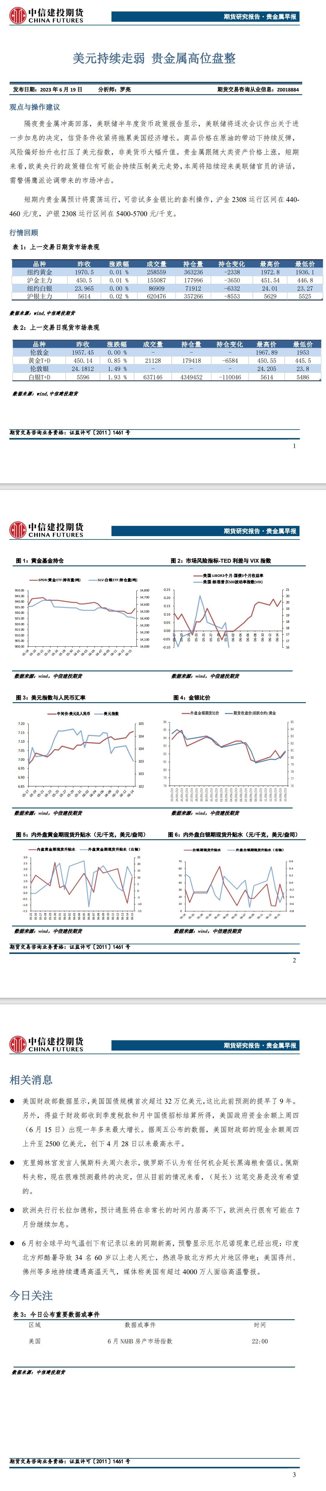 标题:中信建投期货6月19日贵金属日报:美元持续走弱 贵金属高位盘整