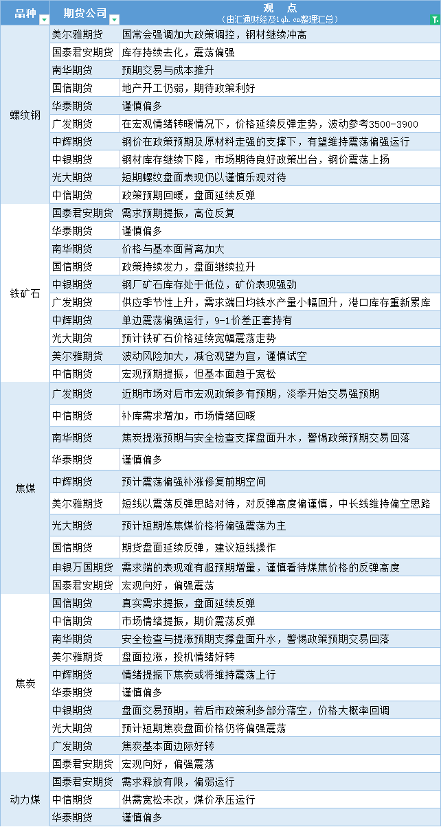 期货公司观点汇总一张图:6月19日黑色系(螺纹钢、焦煤、焦炭、铁矿石、动力煤等)