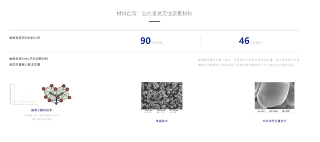 蜂巢能源自主研发的层状无钴正极材料和无钴电池填补了国际空白,为世界首创。蜂巢能源经过近百次中试调试和电性能验证,研制出世界首款无钴正极材料并量产装车,成功获得69项中国专利和46项国际专利。在蜂巢能源研发中心内部设有前沿实验室,专门针对前瞻性技术的研究,除了无钴电池外,还有很多的新型结构和材料等,都在做进一步的开发。