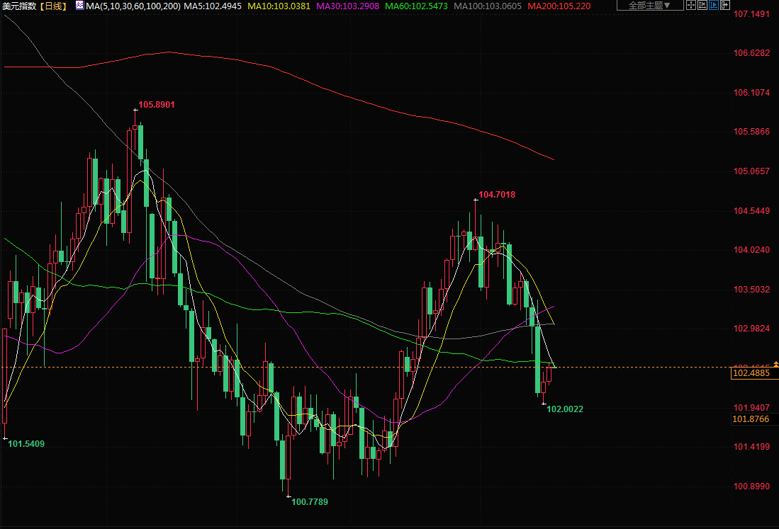 美元指数上升0.2%,至102.480,仍距离上周五触及的一个月低位102.00不远。投资者预计英国央行在周四开会时将至少加息25个基点,该央行正在抗击是其目标水平四倍的通胀。
