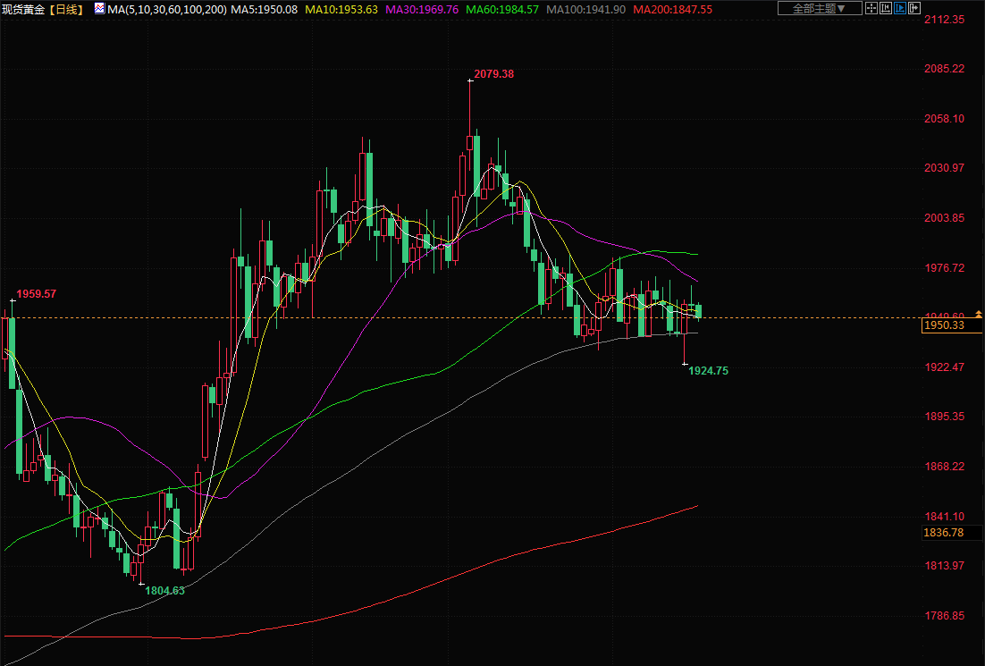 商品收盘情况:美国期金下跌0.4%,报1964.00美元。