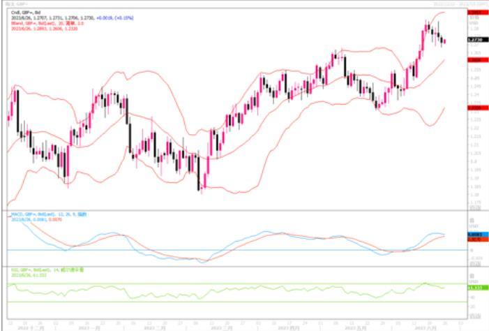 英镑兑美元日内下跌多达0.5%,一度低见1.2685美元。之后跌幅缩减为0.4%,报1.2702美元,但本周周线将下跌近1%,为5月中旬以来最大周度跌幅。在英国央行为应对顽固的通胀而大幅加息后,人们对英国经济可能陷入衰退的预期不断升温。英国央行上周四将利率提高到2008年以来的最高水平,加息50个基点虽在市场预料之中,但这让一些投资者措手不及。货币市场显示,鉴于通胀在更广泛的经济层面中根深蒂固,英国利率在今年年底前可能达到6%的峰值,并在该水准保持六个月。如此高的利率峰值预期,令投资者对英国经济衰退的担忧将从现在开始加剧,英镑非但未能从此次巨幅加息中获得任何提振,反而成为了限制英镑上涨的阻碍因素,特别是美联储主席鲍威尔也在发出鹰派的声音情势下。尽管大幅加息加重了对于英国经济衰退的担忧,但是如果进货数据显示,英国经济能够避险衰退,那么在英镑高利率的撑持下,料英镑还是会继续存在上升的理由。日线图上脱离布林带上轨线显现回落态势,但整体还是能保持在20均线上方,暂时还看不出有大跌倾向。