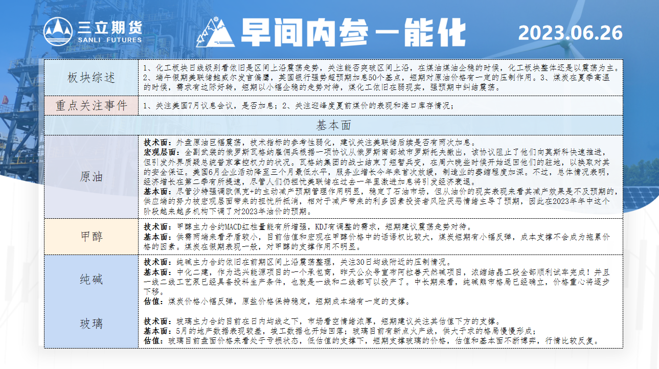 三立期货早间内参显示,化工板块日线级别看依旧是区间上沿震荡走势,关注能否突破区间上沿,在煤油企稳的时候,化工板冲整体还是以震荡为主。端午假期美联储鲍威尔发言偏鹰,英国银行强势超预期加息50个基点,短期对原油价格有一定的压制作用。