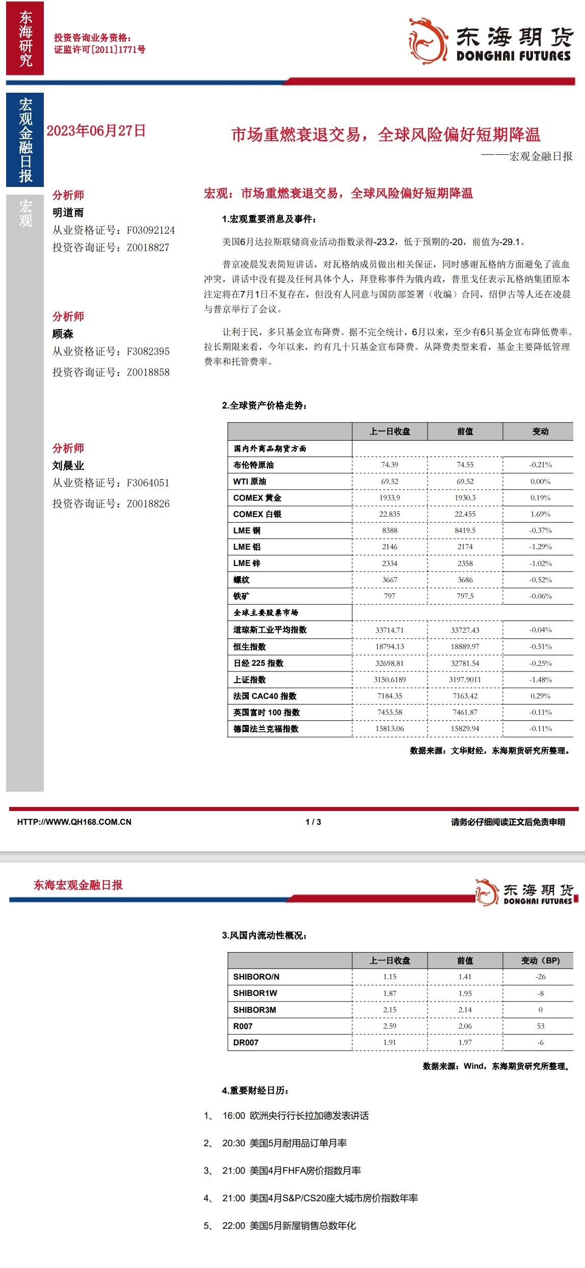 标题:【东海期货6月27日宏观金融日报】:市场重燃衰退交易,全球风险偏好短期降温