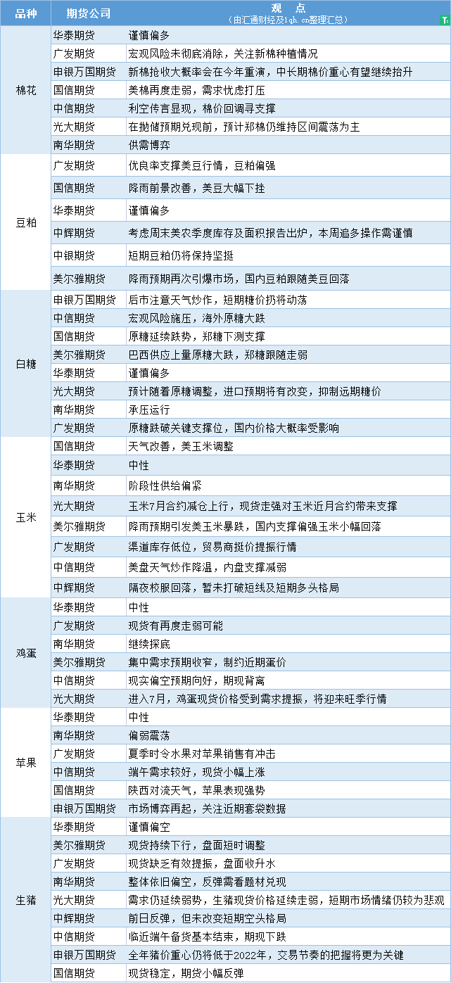 期货公司观点汇总一张图:6月28日农产品(棉花、豆粕、白糖、玉米、鸡蛋、生猪等)