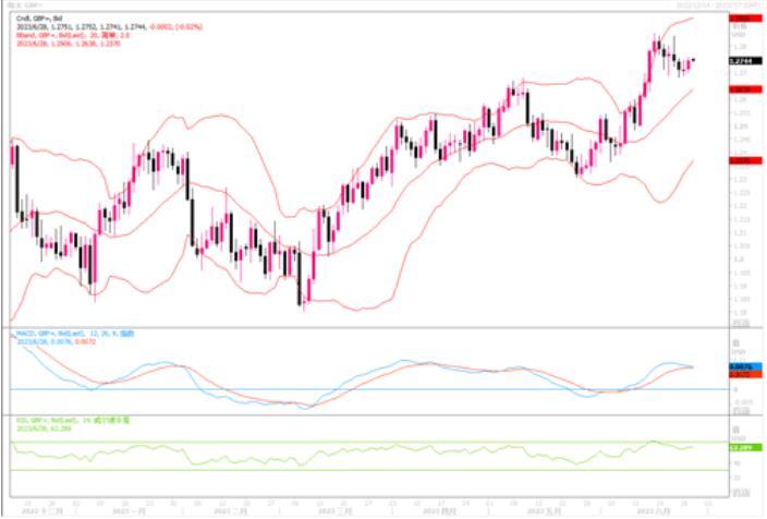 欧元兑美元上涨0.49%,至1.0957美元,稍早一度攀升至1.0976美元的6月22日以来最高。拉加德周二表示,欧元区通胀已进入一个新阶段,可能会逗留一段时间。她称,“短期内央行不太可能全然地有信心地说利率已达峰值。”欧洲央行的其他决策者预计,不会有明确的证据表明通胀已经放缓到足以让欧洲央行暂停加息的程度。欧央行众多主要官员对于继续加息的鹰派态度,当日提振欧元反弹上冲。同时间,5月美国资本财新订单意外增加,但4月数据被下修,表明企业对新资本投资仍在一定程度上持谨慎态度,美元出现回落。日线图上,欧元/美元继续顽强守护在1.09水平之上,技术指标MACD仍保持上行态势,未显转弱痕迹,上方若能再度冲破1.10阻力水平,后市有望拓展更进一步的上升空间。日内下方的初步支撑上移至1.0880附近。