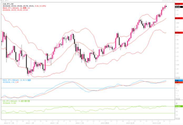 周二(6月27日)日元兑美元下跌0.36%,报144.02,稍早曾触及144.02的11月10日以来最低,投资者关注日本央行可能进行干预,该央行上次干预时,日元兑美元为145左右。此前公布的一系列经济数据显示美国经济仍有韧性,世企研公布6月消费者信心指数从上月的102.5上升至109.7,为2022年1月以来最高。5月新屋销售和4月房价等其他数据也表明,住房市场已经经受住了美联储利率上升的考验。为此,市场现预计美联储将在7月将关键利率提高25个基点。而日本方面,虽然政府以及央行官员纷纷跳出来口头对日元的贬值发表警示,但是在全球各主要经济体为应对顽固的高通胀纷纷走上了快速加息的道路,而日本央行则顽固维持宽松的货币政策,套利交易将不得不驱使投资者离弃日元。日线图上,
