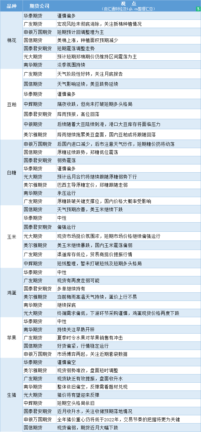 期货公司观点汇总一张图:6月29日农产品(棉花、豆粕、白糖、玉米、鸡蛋、生猪等)